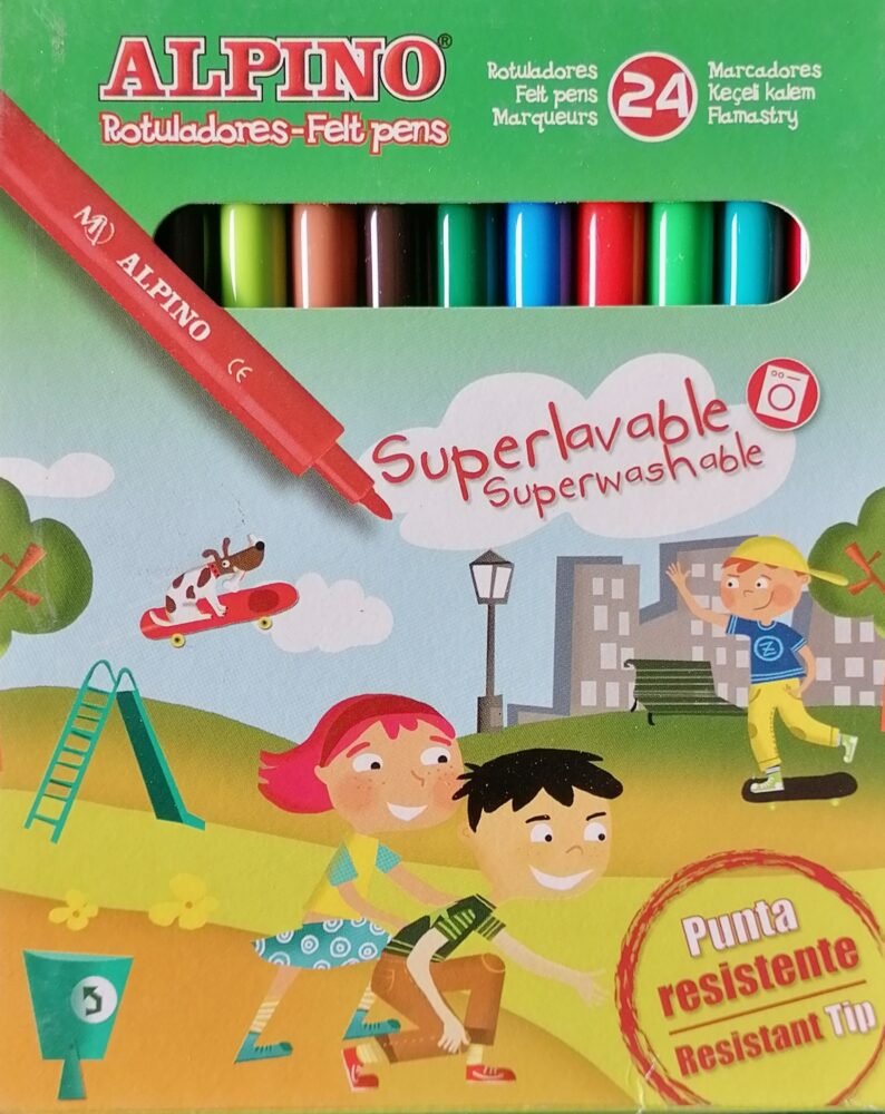 Σετ 24 χρωματιστών μαρκαδόρων. Εχουν ζωντανά χρώματα και εξαιρετική ποιότητα μελανιού που αφαιρείται εύκολα στο πλύσιμο. Διακρίνονται για την ποιότητα και τα ασφαλή μη-τοξικά υλικά τους.